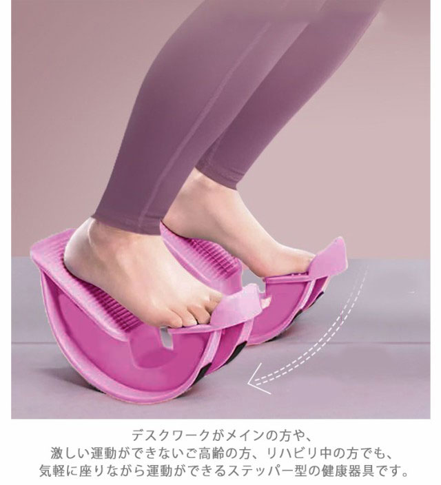 | デスクワークがメインの方や、激しい運動ができないご高齢の方、リハビリ中の方でも、気軽に座りながら運動ができるステッパー型の健康器具です。 椅子に座りながら両足をペダルに乗せて前後に動かします。テレワーク中やリビングで動画やテレビを鑑賞しながらでも行えます。 足の裏から腰にかけて、下半身をしっかり鍛える!体幹・筋力アップをマルチにサポートします。 ウォーキングに近い足首運動ができ、足首の柔軟性をサポートします。筋トレだけでなく、成人や高齢者のエクササイズにも最適です。 雨の日で運動ができない時、スポーツジムに行くのが億劫な時、自宅に大きな器具が置けない時でも、足の運動ができます。 運動をしない場合でも、デスクワーク中の足置きにすることで、正しい姿勢をサポートします。 | |