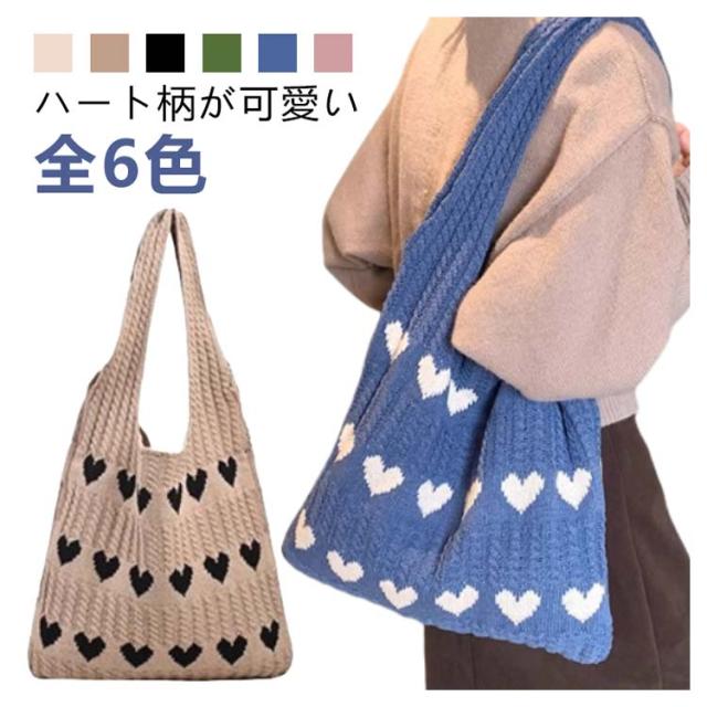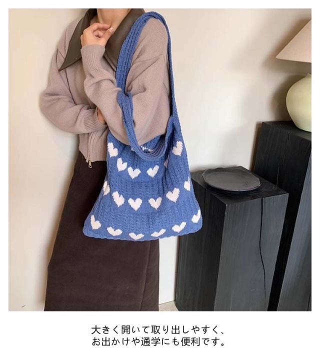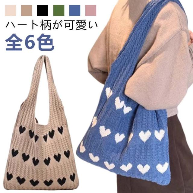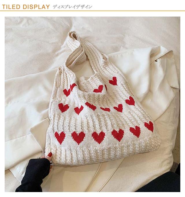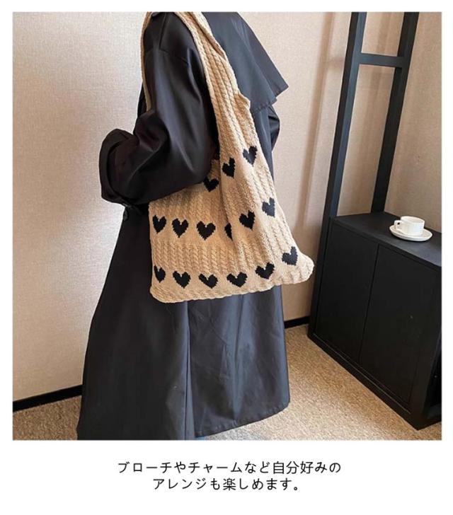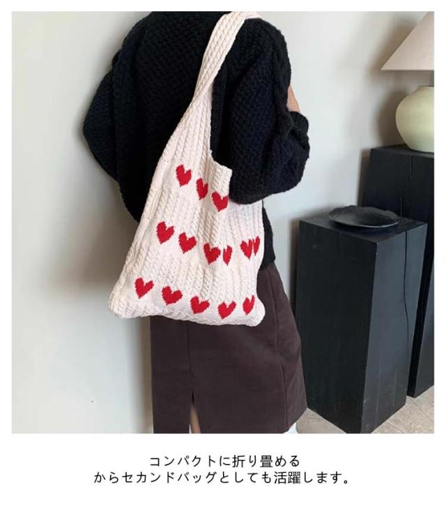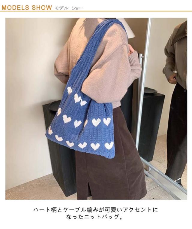 ニットバッグ ハート柄 編みバッグ トートバッグ ケーブル編み ニット トート バッグ 大容量 A4 レディース 大きめ オールシーズン おしゃれ ショルダーバッグ 肩掛け 軽量 エコバッグ カジュアル 可愛い 韓国ファッション マルシェバッグ
