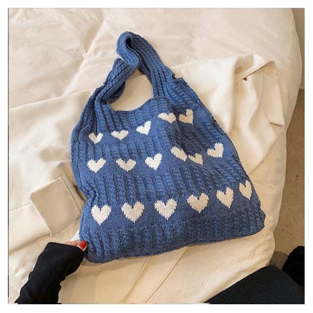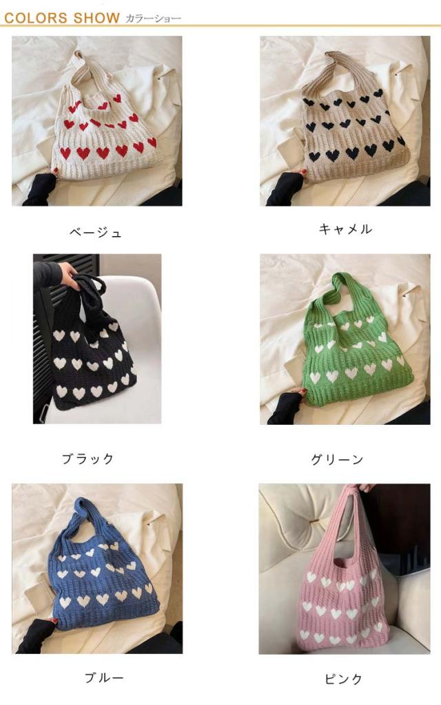 | 【全6色】ハート柄が可愛い♪ ハート柄とケーブル編みが可愛いアクセントになったニットバッグ。 大きく開いて取り出しやすく、お出かけや通学にも便利です。 コンパクトに折り畳めるからセカンドバッグとしても活躍します。 ブローチやチャームなど自分好みのアレンジも楽しめます。 A4サイズも収納可能で見た目以上に大容量でデイリー使いやお出かけにも使いやすいサイズ感◎ | |