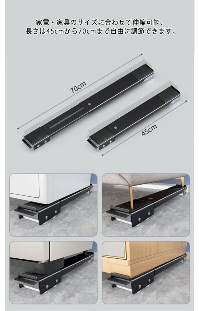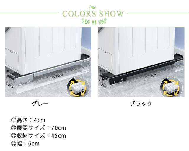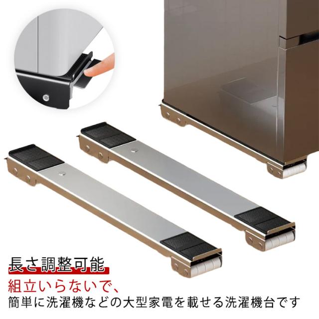 洗濯機 台 ブラケット 簡易式 冷蔵庫置き台 キャスター付き 移動できる 洗濯機パン 冷蔵庫 ラック ランドリーラック 伸縮式 長さ調整可能 洗濯機置き台 スライド 滑り止め ドラム式洗濯機 ドラム式対応 洗濯機台 グレー ブラック