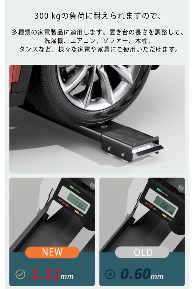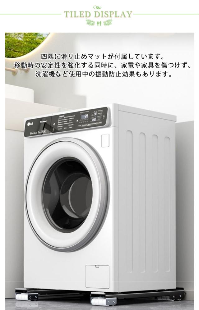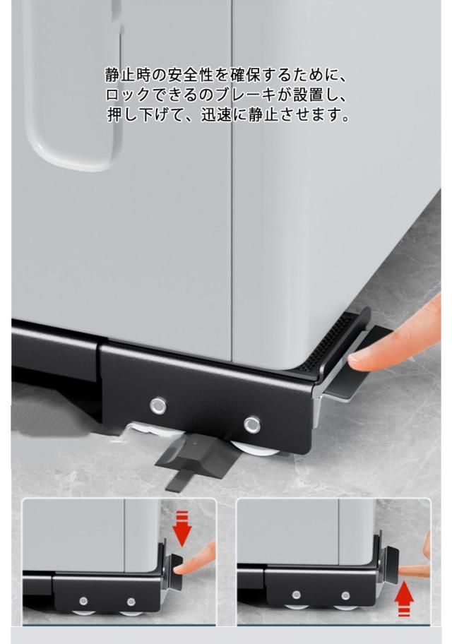 | 組立いらないで、簡単に洗濯機などの大型家電を載せる洗濯機台です。 静止時の安全性を確保するために、ロックできるのブレーキが設置し、押し下げて、迅速に静止させます。 家電・家具のサイズに合わせて伸縮可能、長さは45cmから70cmまで自由に調節できます。 四隅に滑り止めマットが付属しています。移動時の安定性を強化する同時に、家電や家具を傷つけず、洗濯機など使用中の振動防止効果もあります。 300 kgの負荷に耐えられますので、多種類の家電製品に適用します。置き台の長さを調整して、洗濯機、エアコン、ソファー、本棚、タンスなど、様々な家電や家具にご使用いただけます。 | |