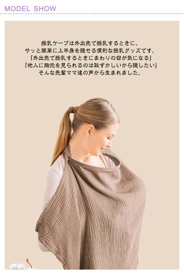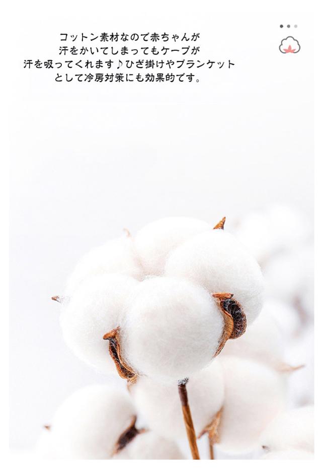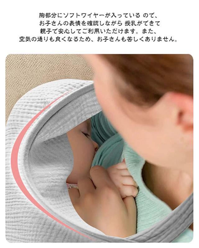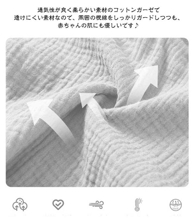 | 柔らかいコットン素材の授乳ケープになります♪ 授乳ケープは外出先で授乳するときに、サッと簡単に上半身を隠せる便利な授乳グッズです。「外出先で授乳するときにまわりの目が気になる」「他人に胸元を見られるのは恥ずかしいから隠したい」そんな先輩ママ達の声から生まれました。 胸部分にソフトワイヤーが入っている ので、お子さんの表情を確認しながら 授乳ができて親子で安心してご利用いただけます。また、空気の通りも良くなるため、お子さんも苦しくありません。通気性が良く柔らかい素材のコットンガーゼで透けにくい素材なので、周囲の視線をしっかりガードしつつも、赤ちゃんの肌にも優しいです♪ 大判サイズでお子さんとママをすっぽり包み込み、周りからの視線も気になりません。屋外で使う際もすっぽり覆うことで赤ちゃんも慣れない場所でも安心してすれます。 長時間、紫外線に当たらないように、ケープなどを使って土ぼこりや強い紫外線から赤ちゃんを守ってあげましょう。首元のDカンで調節が可能です。ずれ落ち防止にもなります。 コンパクトで持ち運びも便利!本来は首元に来るループ部分ですが、長さを調節してベビーカーにひっかけると日除け対策にも使えるんです♪ コットン素材なので赤ちゃんが汗をかいてしまってもケープが汗を吸ってくれます♪ひざ掛けやブランケットとして冷房対策にも効果的です。 | |