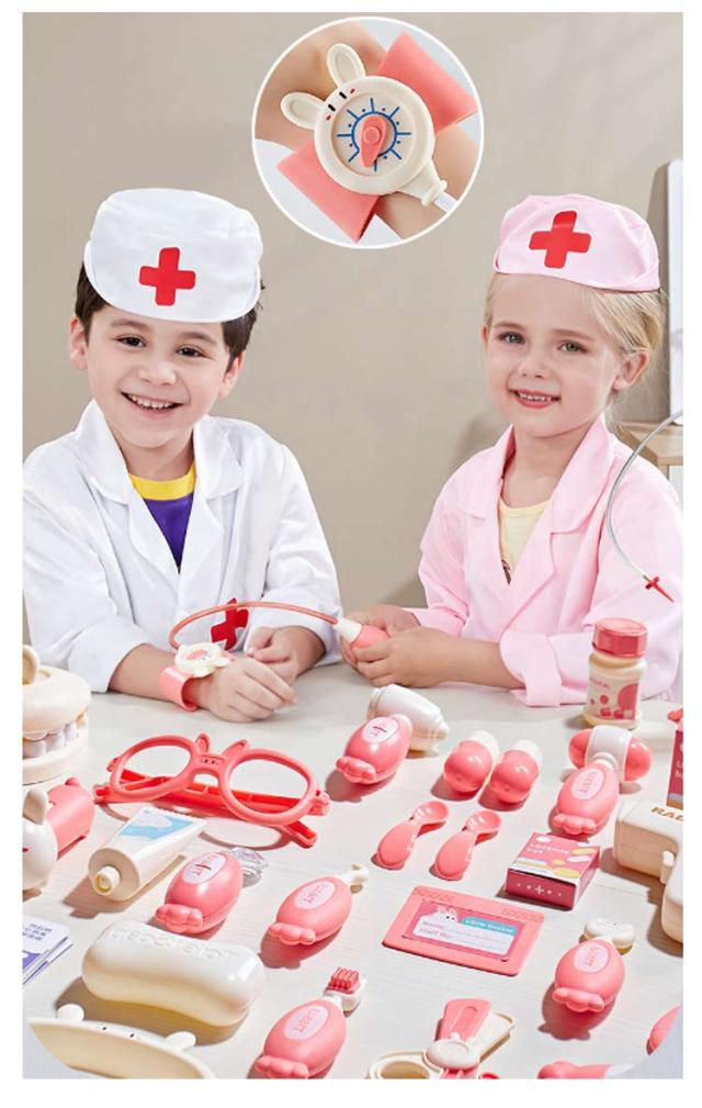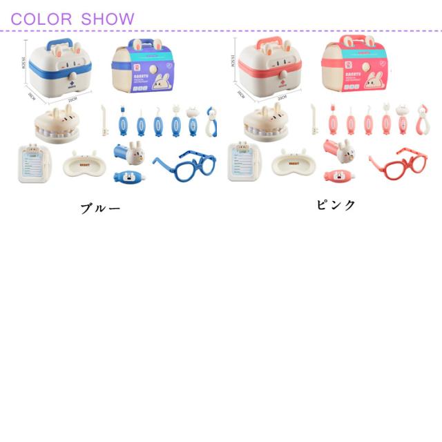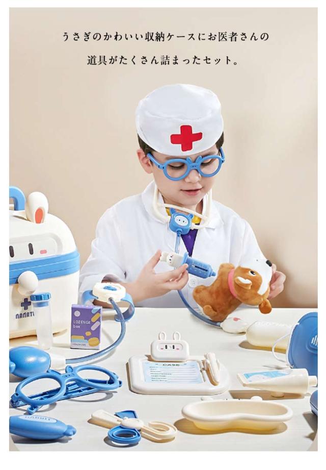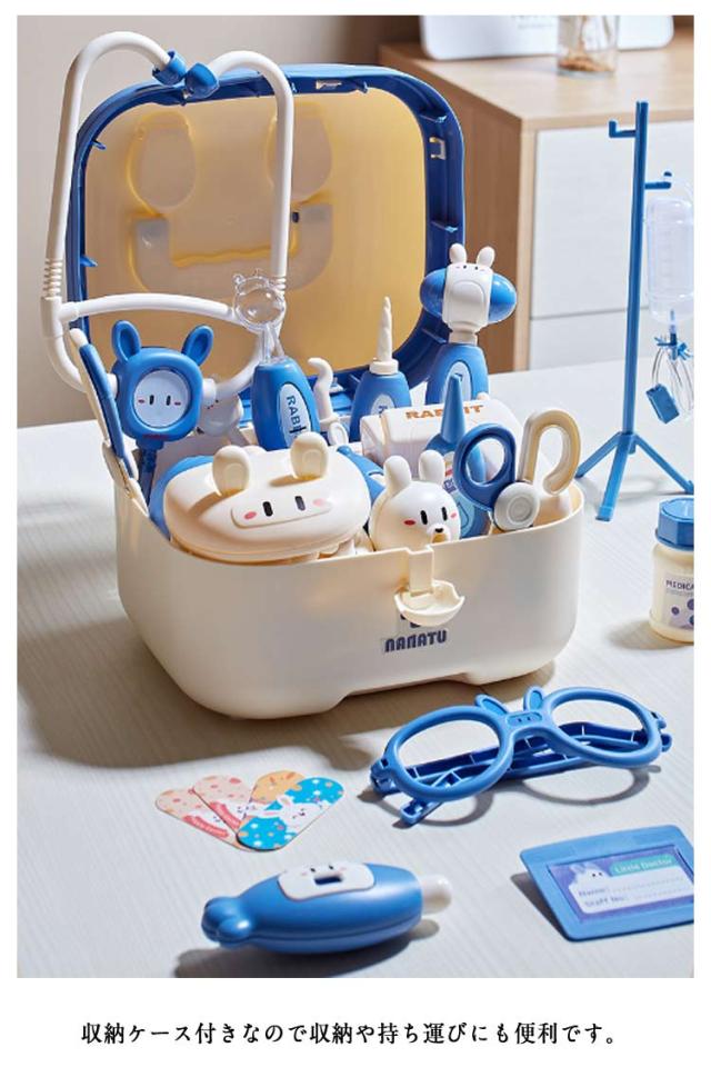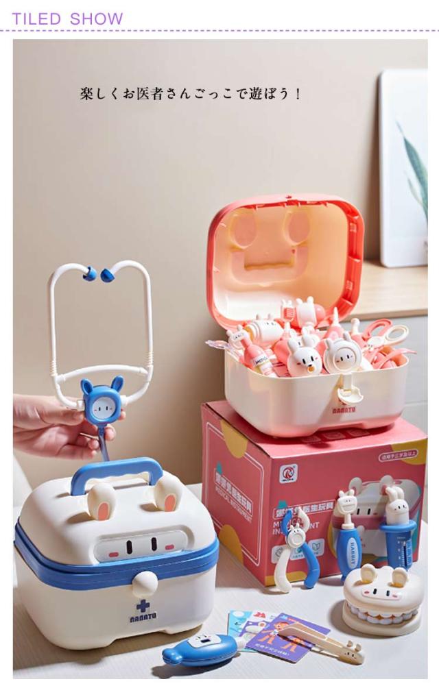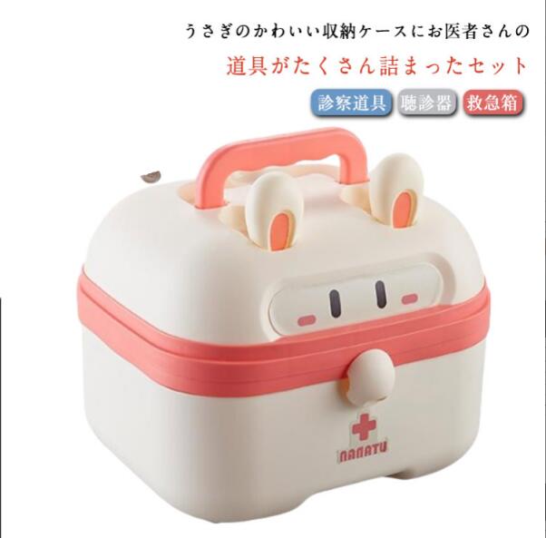 | うさぎのかわいい収納ケースにお医者さんの道具がたくさん詰まったセット。 このお医者さんセットは、リアルすぎず、子どもにとっては親しみやすいデザインといえます。 収納ケース付きなので収納や持ち運びにも便利です。 楽しくお医者さんごっこで遊ぼう! | |