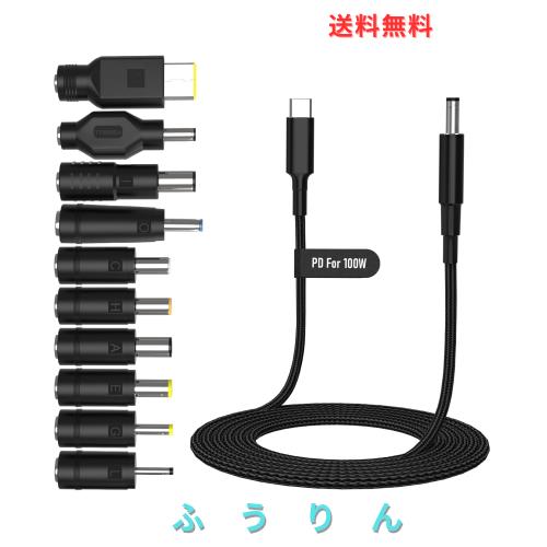 ノートパソコン用 マルチプラグケーブル USB C DC電源ケーブル USB Cオス→DCジャックオス 18.5V~20V 最大100W ノートパソコン 充電ケー