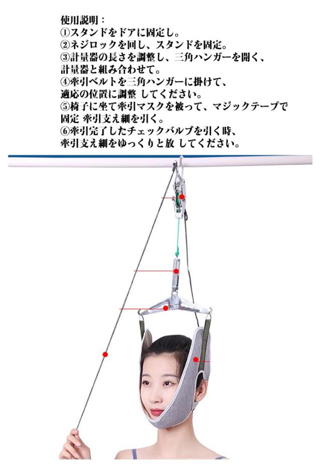 | 【ネックストレッチャー頸椎】椎骨の再調整と安定化に役立ちます。 筋肉のこわばりやストレスによる首や脊椎の痛みを簡単かつ迅速に和らげます。 【ネックトラクション装置】2インチ以下の厚さのドアに適合します。背骨減圧機は、自宅、オフィス、旅行などのドアのある場所で簡単に理学療法の練習を行うことができます。中空コアドア用ではありません。 【トラクションストレッチャー】ギアデザイン! 【脊椎減圧機】頸椎症、首・脊椎減圧の治療、筋肉や神経組織への圧迫、頸椎の軽度の骨折などを緩和します。 【理学療法マッサージャー】気をつけて! 治療後、ロープを解放する代わりに、ゆっくりと立ち上がってチンストラップを外します。 使用説明:1.スタンドをドアに固定し。 2.ネジロックを回し、スタンドを固定。 3.計量器の長さを調整し、三角ハンガーを開く、計量器と組み合わせて。 4.牽引ベルトを三角ハンガーに掛けて、適応の位置に調整 してください。 5.椅子に坐て牽引マスクを被って、マジックテープで固定 牽引支え細を引く。 6.牽引完了したチェックバルブを引く時、牽引支え細をゆっくりと放 してください。 | |