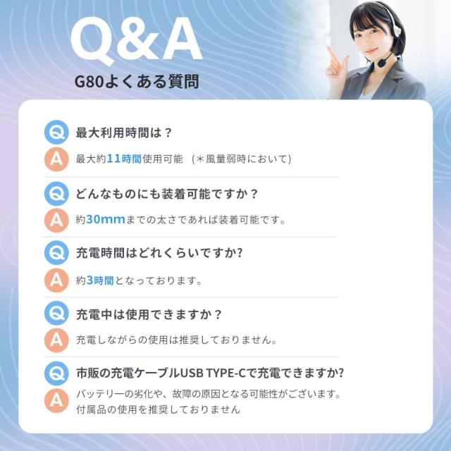 高性能バッテリーを内蔵し、最弱モードでは最大11時間もの連続使用が可能。風量を中程度にしても約9時間、強風モードでも8時間使えるため、通勤や屋外イベント、キャンプなど長時間の使用にも安心。USB充電にも対応しており、どこでも充電しやすく、モバイル性に優れた一台です。軽量かつコンパクトで、バッグに入れても邪魔になりません。