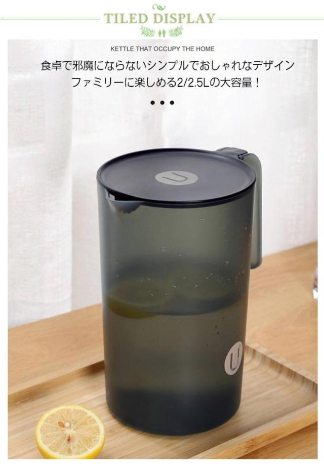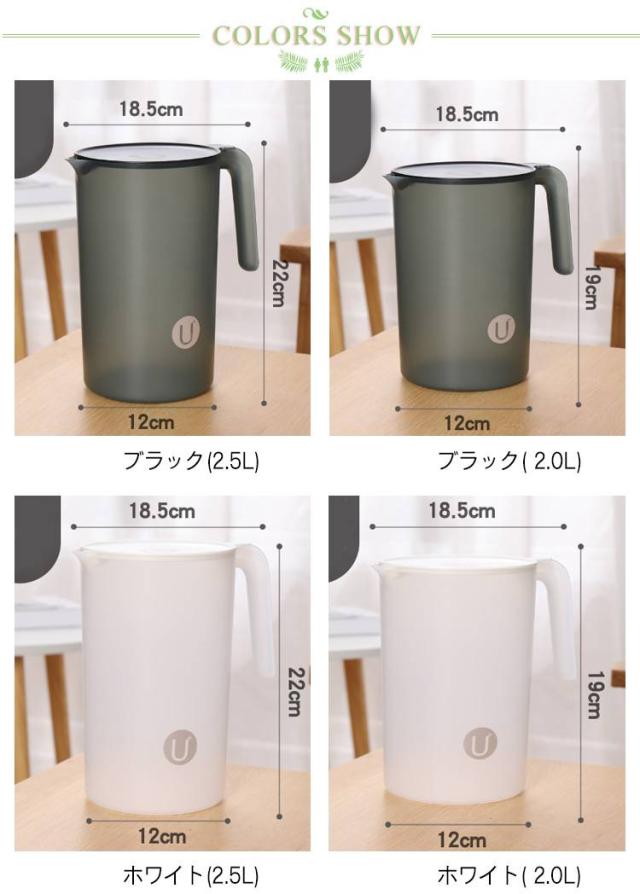 | 【2000ml/2500ml】 1年通じて大活躍する冷水筒 食卓で邪魔にならないシンプルでおしゃれなデザイン ファミリーに楽しめる2/2.5Lの大容量! ハンドル付きで取り出しも簡単! お茶や水の保存ももちろん、熱湯を入れることも可能。 シンプル構造でパーツが少なく、広口で奥まで手が入るので、お手入れ簡単にもうれしいポイント。 | |