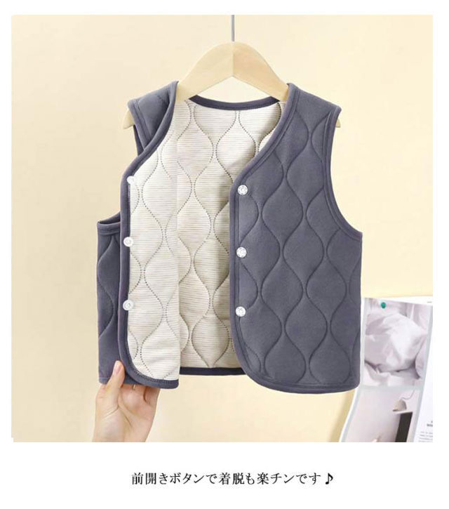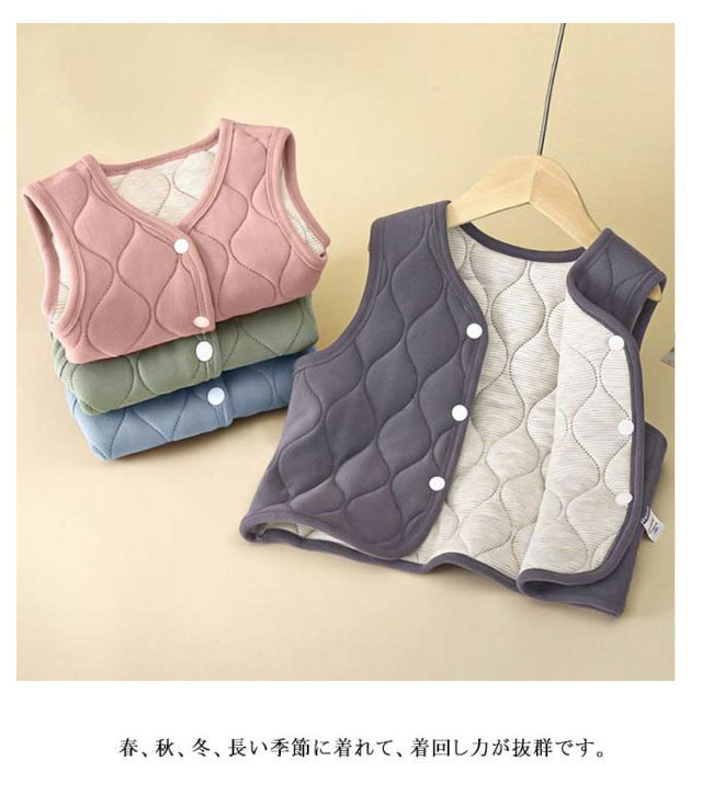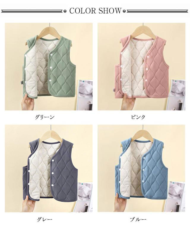 | 【キルティングベスト】【90〜160cm】【保温】 シンプルなベストは男の子、女の子、どちらも着用可能です。 春、秋、冬、長い季節に着れて、着回し力が抜群です。 通園、日常、お出かけなど、1枚持っていると便利です 体をふんわりと柔らかく包み込まれ、暖かくて着心地抜群。 前開きボタンで着脱も楽チンです♪ | |