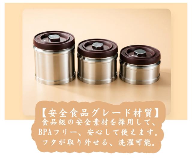 | 【密閉度がより高く】遮光性が良い。軽くて丈夫で高気密、デザインと機能を兼ね備えた保存容器。柔らかいシリコンでしっかり密閉裏蓋四周を覆うによって、空気の通り道が無くなり。湿気を防止することや防水することもできるようになります。おしゃれな酸化や紫外線から守るステンレス製の密封キャニスター。 【収納にぴったり】本容器はコーヒー豆 米びつ ,お茶など食べるものを収納できる。そして、商品の蓋部と底部は、凹凸溝がありますので、重ねても転倒し難いです。 【安全食品グレード材質】食品級の安全素材を採用して、BPAフリー、安心して使えます。フタが取り外せる、洗濯可能。 【持ち運び便利】小型かつ軽量で、持ち運びしやすく、コンパクトで場所にも取りません。 使いやすくて便利だ!真空引き操作手順! 外付けポンプ不要で、一歩で排気を完了!真空を一押し解除! エアポンプを繰り返し押圧する 数回 エアポンプが沈むまで 蓋面約5mmまで高い 真空解除を押すポタン、開蓋 | |