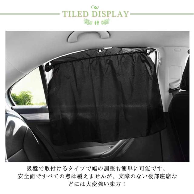 | 夏の紫外線対策に最適!取り外し簡単吸盤タイプの車用カーテン4枚セット。 吸盤で取付けるタイプで幅の調整も簡単に可能です。安全面ですべての窓は覆えませんが、支障のない後部座席などには大変強い味方! 容赦なく差し込む太陽光線のUV対策だけでなく、眩しさや熱さから同乗者を守るだけでなく、車内の目隠しとしても便利です。 屋外に持ち出して、ひざ掛けや遮光したい物のカバーとしても使えるので、お役立ち度は想像以上です♪ 車内の断熱にもなるので、エアコンの効きを良くし、車内を快適にします。 女性が気になる日焼け対策としても、駐車中の防犯・車上荒らし対策や、暑さ対策にもオススメ。 | |