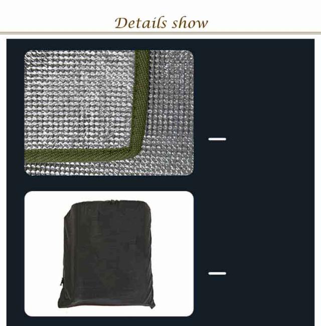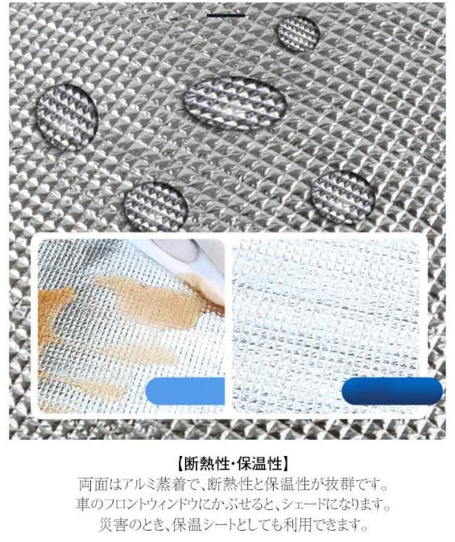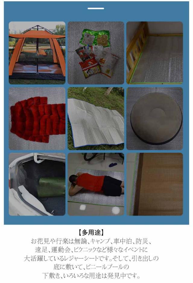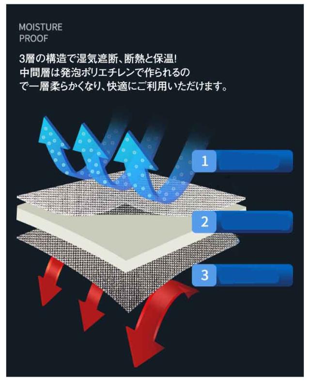 | 床に直接敷くだけ!熱を逃がさず保温力アップ!アルミ断熱シート。 3層の構造で湿気遮断、断熱と保温!中間層は発泡ポリエチレンで作られるので一層柔らかくなり、快適にご利用いただけます。 【撥水加工・防湿機能】撥水加工で雨や汚れに強く速乾性に優れています。急な雨でもレインコート代わりとして使えます。キャンプの時、寝袋下で使用しましたら、地面からの冷え込みを防ぐことができます。 【断熱性・保温性】両面はアルミ蒸着で、断熱性と保温性が抜群です。車のフロントウィンドウにかぶせると、シェードになります。災害のとき、保温シートとしても利用できます。 【多用途】お花見や行楽は無論、キャンプ、車中泊、防災、遠足、運動会、ピクニックなど様々なイベントに大活躍しているレジャーシートです。そして、引き出しの底に敷いて、ビニールプールの下敷き、いろいろな用途は発見中です。 | |