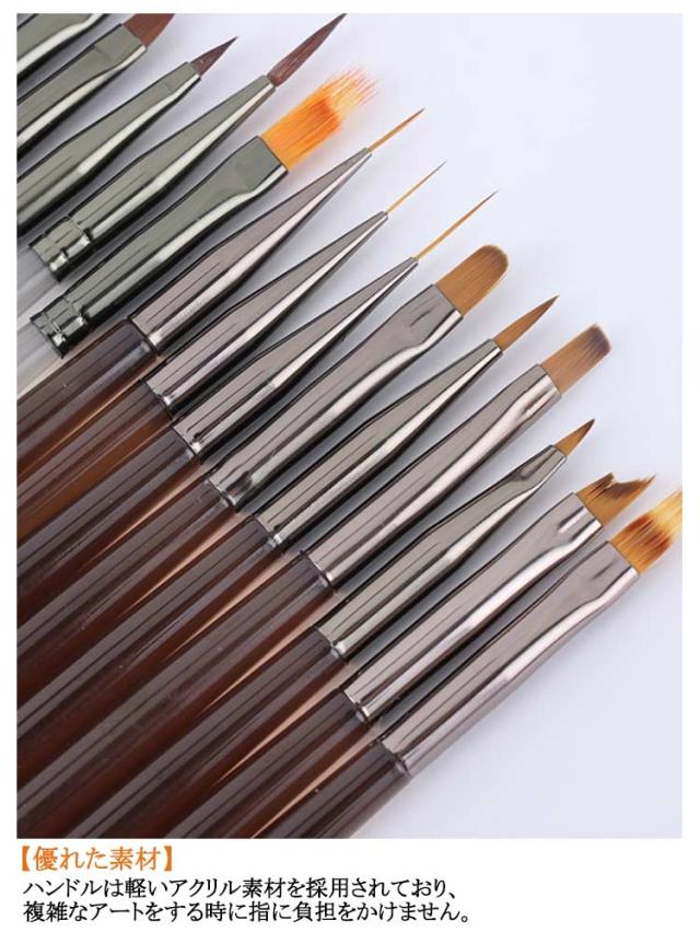 | 9本セットネイルブラシ 【優れた素材】ハンドルは軽いアクリル素材を採用されており、複雑なアートをする時に指に負担をかけません。 【より簡単にネイルアートを】今までジェルが塗りにくい、アートが難しいと感じていた人も、ジェル用ブラシを適材適所で使用すれば苦手だった部分が意外と簡単にできてしまうかもしれない。せっかくセルフでジェルネイルをするんだから、ワンカラーに留まらず、自由な発想で自分だけのアートやデザインを楽しんでみてください。 【ネイルに適したナイロン繊維 】ネイル向きに専門のナイロン繊維を選択、薄くてややハリ感があり、ナイルジェル、パウダーが付きやすい。柔らかく、粘りがありまとまりもよい毛質で、形が崩れにくい、折り曲げにも強く、誰でも手軽に本格的なネイルアートを楽しめるので、ネイル好きにおすすめのアイテムである。 【自宅DIY&サロンネイル】ペンのボディは軽量で快適で、持ちやすくペイントしやすいです。また、ネイルペインティングブラシセットは毎日の使用に耐久性があり、プロのサロンや家庭でのDIYネイルアートに最適で、ネイルのベテランや初心者にも適します。 | |