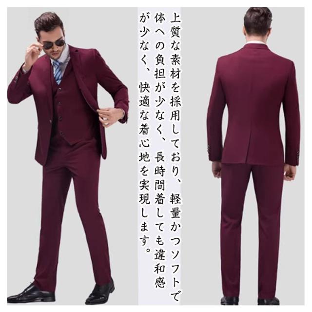 | 3点セット:ジャケット+ズボン+ベスト ビジネスからパーティーシーンまで、こだわり のトレンドスタイルで大人の男をスタイリッシュに彩るスーツ。 上質な素材を採用しており、軽量かつソフトで体への負担が少なく、長時間着しても違和感が少なく、快適な着心地を実現します。 ジャケットはウエストラインを強調させたスラ ント仕様で、パンツは太ももから裾にかけてのラインがス マートな印象で、足を長くスッキリと見せる細めの美脚シルエット。 エレガントラグジュアリーな雰囲気を醸して、 お勧めの一着となります。 場合:結婚式、宴会、成人の日、通勤、旅行、 カジュアル、日常、デート。 | |