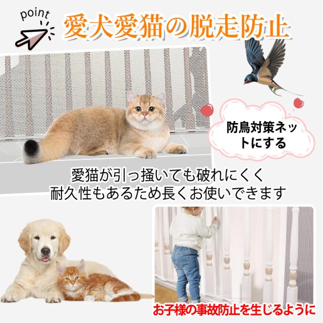【ベビーの安全対策】編み目が細かい、安全ネットは全面に階段の隙間ごとに覆かった、ベランダや、階段の手すりの隙間からお子さま自身やおもちゃなどの落下を防止する安全ネット。 獣侵入防止や猫脱走防止とっいたにも役立できます。
