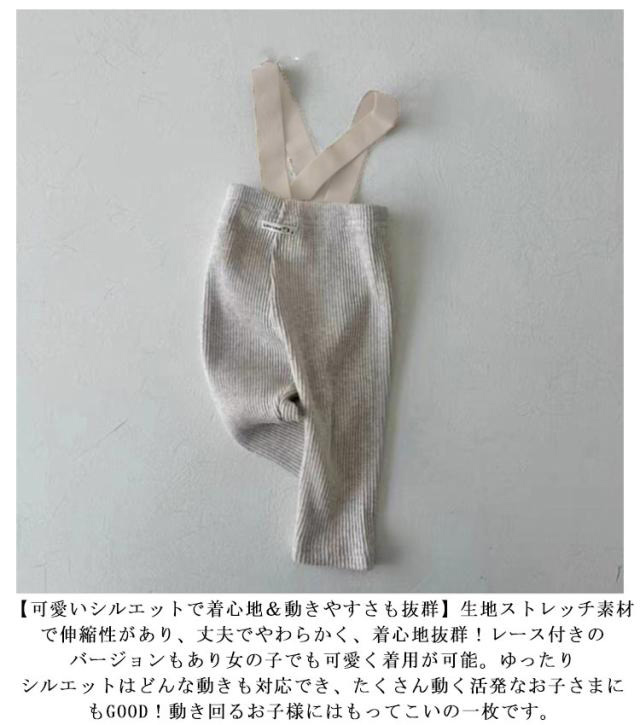 | 伸縮性が非常に高い赤ちゃん用のサスペンダー付きレギンス 春秋冬のスリーシーズンしっかり使えるので色違いでいくつもっていても重宝します 【オールシーズン使える/普段着にぴったり】ストレッチ素材で普段着に活躍するサスペンダー付きのハイウエストレギンスです。伸縮性が高く、生地も柔らかいので、普段着にもお出かけにも大活躍。カラー展開が豊富で数枚持っていると便利。様々なシャツやトップスに合わせて着用するだけで合わせやすく着回し抜群なのでプレゼントやペアルック、お揃いコーデなどでも重宝し贈り物にぴったり。公園遊びやアウトドア・普段のお出かけも生地が丈夫なので安心です。 【可愛いシルエットで着心地&動きやすさも抜群】生地ストレッチ素材で伸縮性があり、丈夫でやわらかく、着心地抜群!レース付きのバージョンもあり女の子でも可愛く着用が可能。ゆったりシルエットはどんな動きも対応でき、たくさん動く活発なお子さまにもGOOD!動き回るお子様にはもってこいの一枚です。 【シンプルかつ飽きのこないデザイン】お出かけの日はもちろん、通園・通学や公園遊びなど、さまざまなシーンで活躍。 兄弟姉妹でお揃いにしたり、お友達同士でのリンクコーデにもおすすめです。 | |