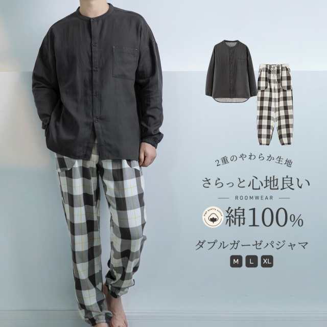 パジャマ 上下セット ダブルガーゼ ガーゼパジャマ メンズ 男 綿100% 長袖 秋 春 夏 冬 前開き ダブルガーゼ パジャマ ノーカラー