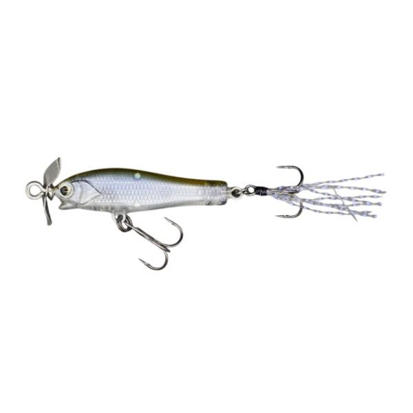 青木大介プロデュース!!スナック感覚。一口サイズのマイクロプロップ。ボディデザインは小魚を意識したスリムフォルムを採用。フロント側には巻き抵抗感を生む為のマイクロリップ搭載。ルアーのコアとなるプロップはステンレス製0.3mm採用。強度とプロップのレスポンスを両立。プロップ形状はゆっくり巻いてもしっかり動くオリジナルデザインを採用。水面直下をゆっくり巻く為、スローシンキング仕様。