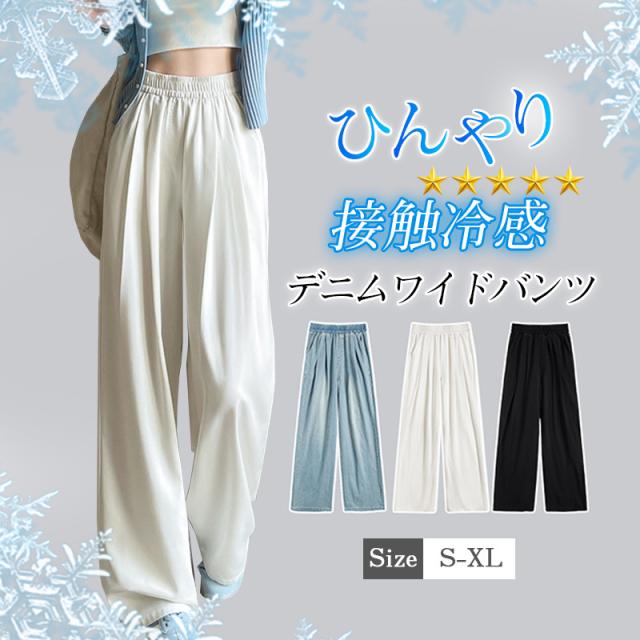 ワイドパンツ レディース ワイドデニム 涼感 デニムパンツ ひんやり 接触冷感 UVカット ジーンズ 着痩せ ウエストゴム ジー