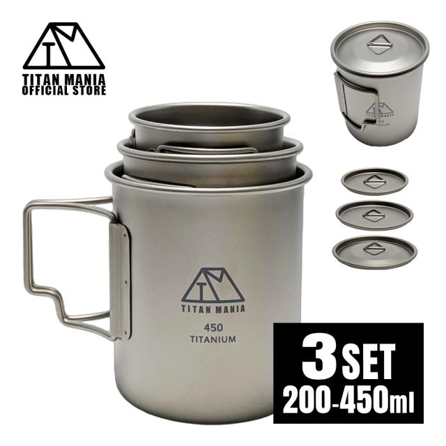 TITAN MANIA チタンマニア マグカップ チタン製 蓋付き 200/300/450ml 3点セット 全てのサイズが蓋ごとスタッキング出来る 超軽量 折りたたみハンドル 直火 錆びない キャンプ ソロキャンプ アウトドア用品 キャンプ用品 収納袋付き