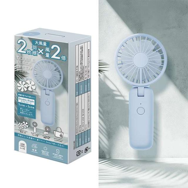■商品名:Wブレードハンディファン ブルー 扇風機 手持ち ポータブル 暑さ対策 おでかけ 外出 通勤 通学