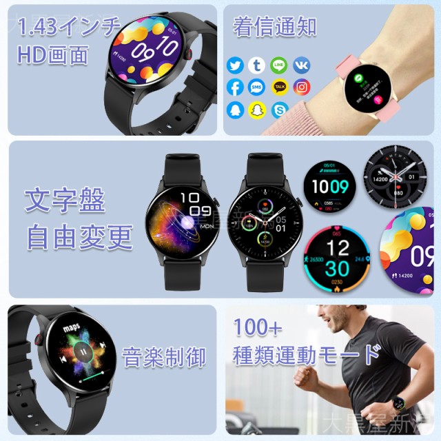 スマートウォッチ Bluetooth5.3通話機能 血糖値 1.43インチAmoledスクリーン 酸素濃度 GPS内蔵 心拍数 健康管理 睡眠管理 活動量計 着信通知 プレゼント