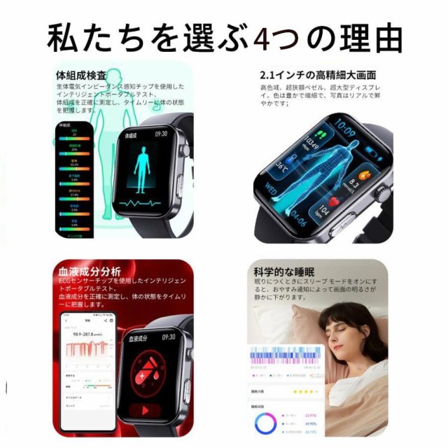 スマートウォッチ 血糖値 通話機能 心電図ECG+PPG 血圧測定 血液成分 尿酸脂質 体温測定 24時間高精度心拍数 睡眠検測 血中酸素 SOS機能 iPhone/Android 対応