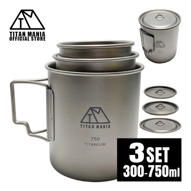 TITAN MANIA チタンマニア マグカップ チタン製 蓋付き 300/450/750ml 3点セット 全てのサイズが蓋ごとスタッキング出来る 超軽量 折りたたみハンドル 直火 錆びない キャンプ ソロキャンプ アウトドア用品 キャンプ用品 収納袋付き