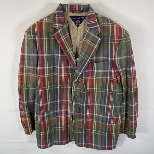古着 トミーヒルフィガー TOMMY HILFIGER USA製 テーラードジャケット コットンジャケット チェック柄 ブレザー 44L レッド メンズ