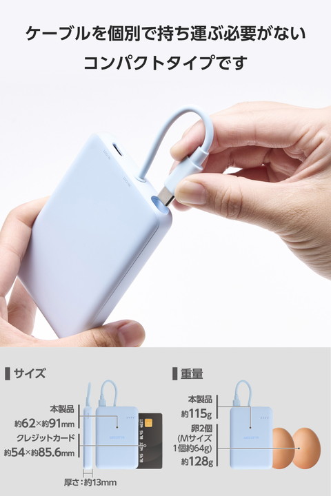 ケーブル一体型だから、思い立ったらすぐ使える。スマートフォンを使いながら充電するのに便利な、ケーブル一体型のモバイルバッテリーです。持ち運びに便利なコンパクトサイズで、最大12Wの出力。外出先での急なバッテリー切れの際も安心です。