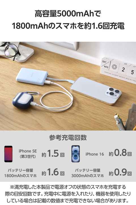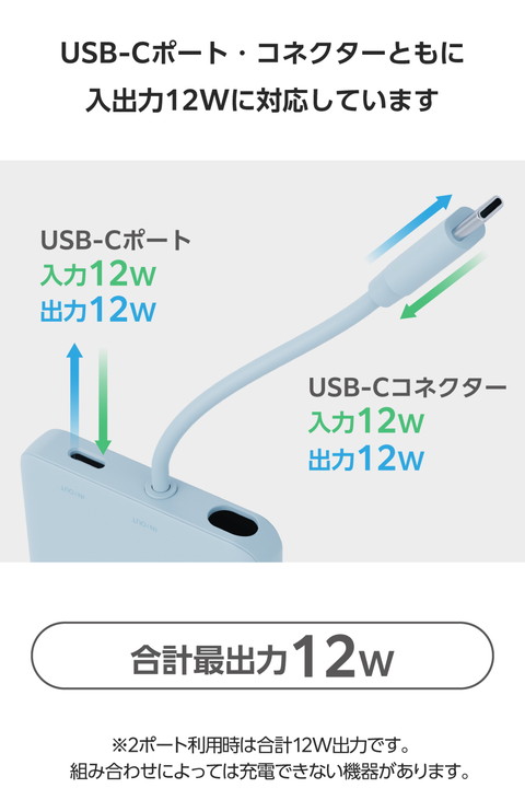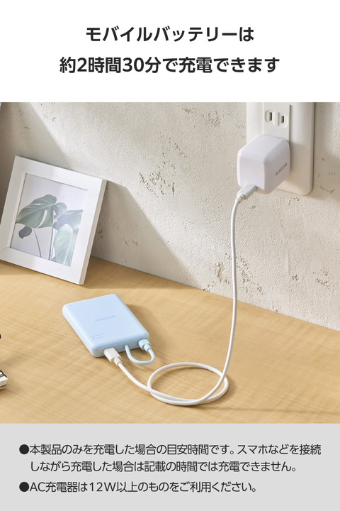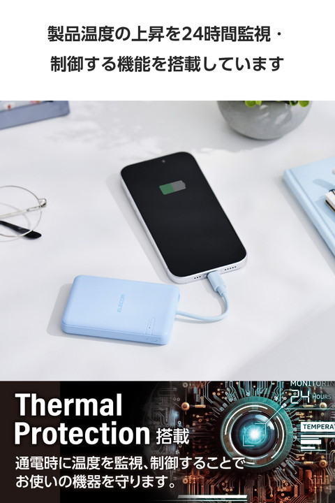 ケーブル一体型だから、思い立ったらすぐ使える。スマートフォンを使いながら充電するのに便利な、ケーブル一体型のモバイルバッテリーです。持ち運びに便利なコンパクトサイズで、最大12Wの出力。外出先での急なバッテリー切れの際も安心です。![]() ■本体にケーブルが付属した、ケーブル一体型のモバイルバッテリーです。 ■ポーチや小さなバッグにも収まるコンパクトサイズ。ケーブルをわざわざ持ち運ぶ必要がないので、お出かけの際の持ち運びにも便利です。 ■最大出力12Wでの充電が可能。本体付属のケーブルからはもちろん、USB Type-Cポートに別途ケーブルを接続して2ポート同時充電も可能です。 ■本製品(バッテリー容量5000mAh)で、1800mAhのスマートフォンを約1.6回、3000mAhのスマートフォンを約0.9回充電可能です。 ■※満充電した本製品で電源オフの状態のスマートフォンを充電する際の目安回数です。充電中に電源を入れたり、機器を使用したりしている場合は記載の数値まで充電できない場合があります。 ■スマートフォンなどのデバイスへの充電と、本製品への充電も同時に行える“まとめて充電”に対応しています。 ■※同時接続時は、スマートフォンへ優先的に充電されます。スマートフォンの充電が完了すると本製品に充電されます。 ■約2時間30分で本製品の満充電が可能。AC充電器に本体付属のケーブルを直接挿して充電できます。 ■※本製品のみを充電した場合の目安時間です。スマートフォンなどのモバイル機器を接続しながら充電した場合は記載の時間では充電できません。 ■約500回繰り返し使用可能な充電式リチウムイオン電池を搭載しています。 ■内蔵の充電式リチウムイオン電池は、JIS C8711およびJIS C8712(JIS C8714の内容を含む)に準拠した安全設計です。 ■Thermal Protectionを搭載し、製品温度の上昇を24時間監視・制御。自動で出力をコントロールし、お使いの機器を守ります。 ■日本の電気用品安全法(PSE)の技術基準に適合した安全性の高い商品です。 ■過充電・過放電・過電流防止機能および短絡保護機能と温度検知機能の5つの保護機能を備えた安心の回路設計です。 ■電池容量が160Wh(43,243mAh)以下であるため、機内持ち込みも可能です。 ※航空会社の規定によって例外がある場合があります。 ■※工場出荷時に70%程度充電されています。充電式リチウムイオン電池は時間とともに放電するので、ご使用になる前に充電することを推奨します。 ■※USB Type-C and USB-C are trademarks of USB Implementers Forum. ■本製品は、一般社団法人JBRCの回収対象製品であり、回収協力自治体や協力店(家電量販店・ホームセンターなど)で回収が可能です。 ■※JBRCのホームページでお住まいの地域の回収協力自治体・協力店をご確認ください。 ■自社環境認定基準を1つ以上満たし、『THINK ECOLOGY』マークを表示した製品です。 ■環境保全に取り組み、製品本体の主たる構成部品や構成要素の原料に占めるリサイクル原料の割合が10%を超えている製品です。 ■環境保全に取り組み、製品の包装容器におけるプラスチック重量を、社内基準製品より20%以上削減した製品です。 ■環境保全に取り組み、製品の包装容器が紙・ダンボール・ポリ袋のみで構成されている製品です。 ![]() ■対応機種:iPhoneおよびUSB端子で充電するスマートフォン、タブレット、他小型電子機器 ■定格入力電圧:USB Type-C(TM)ポート/プラグ(ケーブル部):5V ■定格入力電流:USB Type-Cポート/プラグ(ケーブル部):2.4A ■コネクター形状:USB Type-Cポート×1、USB Type-Cプラグ(ケーブル部)×1 ■定格出力電圧:USB Type-Cポート/プラグ(ケーブル部):5V ■定格出力電流:USB Type-Cポート/プラグ(ケーブル部):2.4A(最大出力12W) ■電池種類:充電式リチウムイオン電池 ■電池定格容量:3.7V/5000mAh 18.5Wh ■充電時間:約2時間30分 ※製品本体のみを充電した場合の目安です。スマートフォンなどのモバイル機器を接続した場合は記載の時間では充電できません。 ■外形寸法:幅約62mm×奥行約13mm×高さ約91mm ■重量:約115g ■カラー:ブルー ■くり返し使用回数:500回 ■使用温度範囲:0℃〜40℃ ■電気用品安全法:○PSE 特定以外の電気用品 ■保証期間:1年間 ■その他:Lightningポート搭載の端末で使用する場合は別途Lightningプラグのケーブルをご用意ください。 |