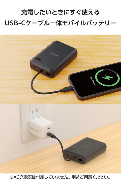 ケーブル一体型だから、思い立ったらすぐ使える。スマートフォンを使いながら充電するのに便利な、ケーブル一体型のモバイルバッテリーです。持ち運びに便利なコンパクトサイズで、USB Power Delivery 最大20Wの出力。外出先での急なバッテリー切れの際も安心です。