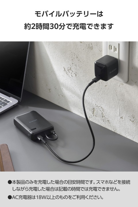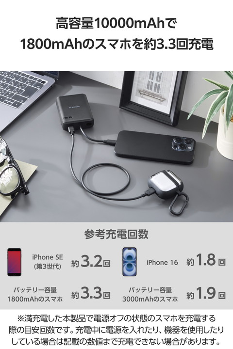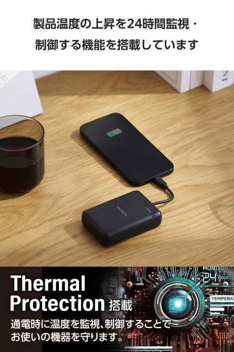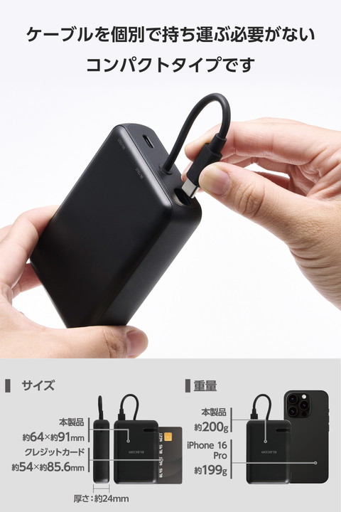 ケーブル一体型だから、思い立ったらすぐ使える。スマートフォンを使いながら充電するのに便利な、ケーブル一体型のモバイルバッテリーです。持ち運びに便利なコンパクトサイズで、USB Power Delivery 最大20Wの出力。外出先での急なバッテリー切れの際も安心です。![]() ■本体にケーブルが付属した、ケーブル一体型のモバイルバッテリーです。 ■ポーチや小さなバッグにも収まるコンパクトサイズ。ケーブルをわざわざ持ち運ぶ必要がないので、お出かけの際の持ち運びにも便利です。 ■最大出力20Wでの充電が可能。本体付属のケーブルからはもちろん、USB Type-Cポートに別途ケーブルを接続して2ポート同時充電も可能です。 ■本製品(バッテリー容量10000mAh)で、1800mAhのスマートフォンを約3.3回、3000mAhのスマートフォンを約1.9回充電可能です。 ■※満充電した本製品で電源オフの状態のスマートフォンを充電する際の目安回数です。充電中に電源を入れたり、機器を使用したりしている場合は記載の数値まで充電できない場合があります。 ■NINTENDO SWITCH(TM)、 NINTENDO SWITCH Lite(TM)に対応しています。 ■スマートフォンなどのデバイスへの充電と、本製品への充電も同時に行える“まとめて充電”に対応しています。 ■※同時接続時は、スマートフォンへ優先的に充電されます。スマートフォンの充電が完了すると本製品に充電されます。 ■約2時間30分で本製品の満充電が可能。AC充電器に本体付属のケーブルを直接挿して充電できます。 ■※本製品のみを充電した場合の目安時間です。スマートフォンなどのモバイル機器を接続しながら充電した場合は記載の時間では充電できません。 ■約500回繰り返し使用可能な充電式リチウムイオン電池を搭載しています。 ■内蔵の充電式リチウムイオン電池は、JIS C8711およびJIS C8712(JIS C8714の内容を含む)に準拠した安全設計です。 ■Thermal Protectionを搭載し、製品温度の上昇を24時間監視・制御。自動で出力をコントロールし、お使いの機器を守ります。 ■日本の電気用品安全法(PSE)の技術基準に適合した安全性の高い商品です。 ■過充電・過放電・過電流防止機能および短絡保護機能と温度検知機能の5つの保護機能を備えた安心の回路設計です。 ■電池容量が160Wh(43,243mAh)以下であるため、機内持ち込みも可能です。 ※航空会社の規定によって例外がある場合があります。 ■※工場出荷時に70%程度充電されています。充電式リチウムイオン電池は時間とともに放電するので、ご使用になる前に充電することを推奨します。 ■※USB Type-C and USB-C are trademarks of USB Implementers Forum. ■本製品は、一般社団法人JBRCの回収対象製品であり、回収協力自治体や協力店(家電量販店・ホームセンターなど)で回収が可能です。 ■※JBRCのホームページでお住まいの地域の回収協力自治体・協力店をご確認ください。 ■自社環境認定基準を1つ以上満たし、『THINK ECOLOGY』マークを表示した製品です。 ■環境保全に取り組み、製品本体の主たる構成部品や構成要素の原料に占めるリサイクル原料の割合が10%を超えている製品です。 ■環境保全に取り組み、製品の包装容器におけるプラスチック重量を、社内基準製品より20%以上削減した製品です。 ■環境保全に取り組み、製品の包装容器が紙・ダンボール・ポリ袋のみで構成されている製品です。 ![]() ■対応機種:iPhoneおよびUSB端子で充電するスマートフォン、タブレット、他小型電子機器 ■定格入力電圧:USB Type-C(TM)ポート/プラグ(ケーブル部):5V/9V/12V ■定格入力電流:USB Type-Cポート/プラグ(ケーブル部):2.4A/2A/1.5A ■コネクター形状:USB Type-Cポート×1、USB Type-Cプラグ(ケーブル部)×1 ■定格出力電圧:USB Type-Cポート/プラグ(ケーブル部):5V/9V/12V ■定格出力電流:USB Type-Cポート/プラグ(ケーブル部):3A/2.22A/1.67A(最大出力20W) ■電池種類:充電式リチウムイオン電池 ■電池定格容量:3.7V/10000mAh 37Wh ■充電時間:約2時間30分 ※製品本体のみを充電した場合の目安です。スマートフォンなどのモバイル機器を接続した場合は記載の時間では充電できません。 ■外形寸法:幅約64mm×奥行約24mm×高さ約91mm ■重量:約200g ■カラー:ブラック ■くり返し使用回数:500回 ■使用温度範囲:0℃〜40℃ ■電気用品安全法:○PSE 特定以外の電気用品 ■保証期間:1年間 ■その他:Lightningポート搭載の端末で使用する場合は別途Lightningプラグのケーブルをご用意ください。 |