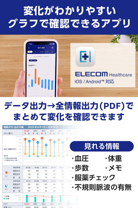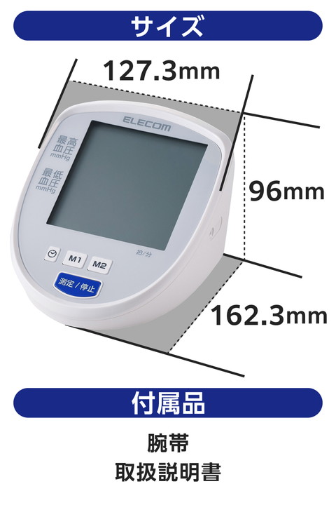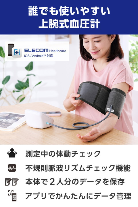 大きな文字パネルで、測定結果がはっきり見える。測定も記録もシンプルな操作で、毎日使える上腕式血圧計です。画面をアプリから撮影して手動でアプリに登録できます。![]() ■大きな文字パネルとシンプルな操作で誰でも使いやすい上腕式血圧計です。 ■タテヨコ8cmの大型液晶画面を搭載。数字が大きく表示されるから、測定結果がはっきり見えます。朝晩の測定時、寝室などの少し暗い場所でも使いやすいモデルです。 ■専用スマートフォンアプリ「ELECOM Healthcare」に測定したデータを記録可能。血圧の変化をグラフで確認できます。 ■画面をアプリから撮影して手動でアプリに登録できます。 ■撮影での記録は、カンタン3ステップ。(1)血圧を測定(2)スマホアプリを開く(3)アプリのカメラで血圧計を撮影 するだけでOKです。製品本体とアプリの通信を設定したり数値を手入力したりする必要はありません。 ■収納しやすい柔らかい装着感のカフです。 ■加圧中に測定を行うため、圧迫感を感じにくく腕にやさしい血圧計です。 ■最新の測定結果の測定時刻から15分以内の測定結果のうち、最大3回分の平均値を自動で表示。都度記録・計算の必要がありません。 ■直近60回分の測定結果とその平均値を本体に記録できます。 ■日時設定ができ、測定記録に自動で日時が記録されます。 ■測定中の脈が適切に検出されていないことをお知らせする、不規則脈波検知機能付きです。 ■測定中に会話したり、体を動かしたりしたことをお知らせする、体動検知機能付きです。 ■単3形アルカリ乾電池4本で駆動します。購入後電池を入れてすぐに使えます。また、別売りの専用ACアダプター(ADP-W5-0304E)も使用可能です。 ■※乾電池は本品に付属していません。別途ご用意ください。 ■※ご使用になる前に必ず取扱説明書をご確認ください。 ![]() ■販売名:上腕式血圧計 AS04 ■製品型番:HCM-AS04WH ■類別:機械器具 18 血圧検査又は脈波検査用器具 ■一般的名称:自動電子血圧計 ■医療機器の種類:管理医療機器 ■医療機器認証番号:226AFBZX00162A01 ■血圧測定範囲:最高血圧:50〜250mmHg/最低血圧:40〜180mmHg ■脈拍数測定範囲:40〜160拍/分 ■測定精度:圧力:150mmHgを超えない場合は±3mmHg以下、150mmHgを超える場合は測定値の2%以下/脈拍数:±5%以内 ■電源:単3 形アルカリ乾電池4本または別売り専用ACアダプター(ADP-W5-0304E) ■サイズ:幅約127.3mm×奥行約162.3mm×高さ約96mm ■質量:約338g(付属品を含まない) ■測定可能腕周:約22〜42cm ■カラー:ホワイト ■内容物:本体×1、取扱説明書×1 ■保証期間:1年間 |