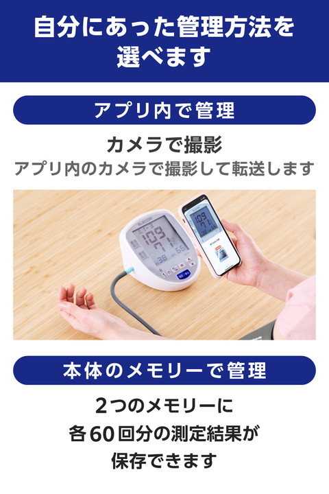 大きな文字パネルで、測定結果がはっきり見える。測定も記録もシンプルな操作で、毎日使える上腕式血圧計です。画面をアプリから撮影して手動でアプリに登録できます。