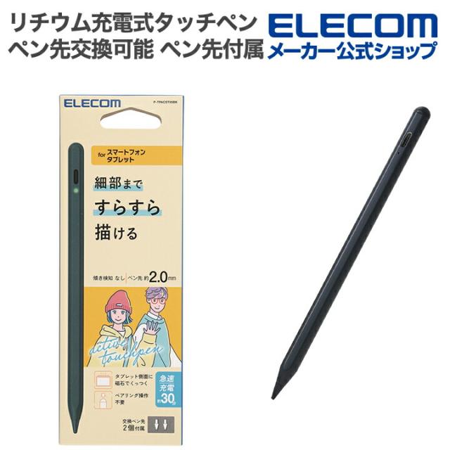 エレコム タッチペン 汎用アクティブ スタイラス リチウム充電式 汎用 磁気吸着 USB-C充電 急速充電 ペン先交換可能 ペン先付属 ブラック┃P-TPACST05BK