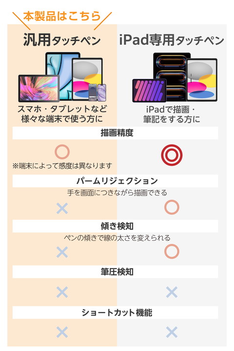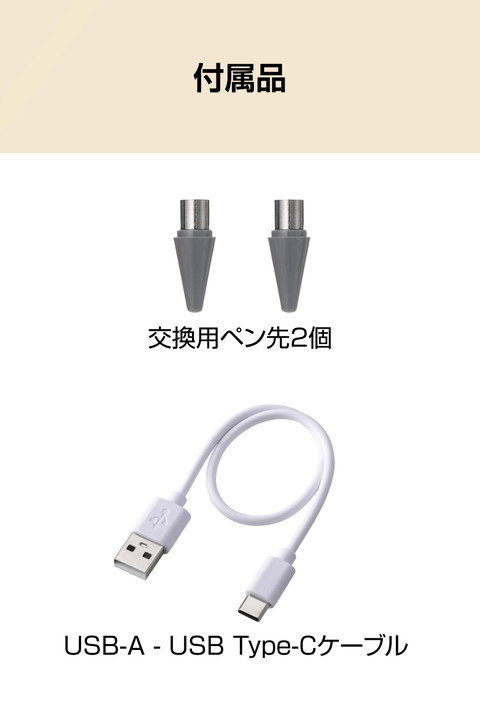 隙間時間の充電ですぐに使える!約30分でフル充電可能な急速充電機能を搭載した、汎用アクティブタッチペンです。約2.0mmのペン先で細かい作業、メモや絵を描くのにおすすめ。ペン先は導電性に優れたポリアセタール樹脂(POM)を採用し、滑らかな描き心地で画面を傷つけにくいです。![]() ■幅広いスマートフォン・タブレットに対応したアクティブタッチペンです。 ■※すべてのタッチパネル電子端末での動作を保証するものではありません。 ■約30分でフル充電可能な急速充電機能を搭載。電池が切れても充電してからすぐに使用できます。 ■約2.0mmのペン先で細かい作業、メモや絵を描くのにおすすめです。 ■ペン先は導電性に優れたポリアセタール樹脂(POM)を採用し、滑らかな描き心地で画面を傷つけにくいです。 ■タッチペンの側面にはマグネット面があり、タブレットに吸着ができるので紛失を防ぎます。 ■※すべてのタブレットに対応するわけではありません。 ■※タブレットに装着するケースによっては、タブレット本体の磁石部分が隠れてしまい、本製品を付けられない場合があります。 ■マグネット面がフラットになっていて、テーブルや床に置いても転がりにくい形状です。 ■USB Type-C(TM)ケーブルで充電が可能で、約7時間の連続使用が可能です。 ■※ご使用状態によっては、目安の時間よりも早く充電が必要になる場合があります。 ■ペアリングが不要で、電源をオンにするだけですぐに使用できます。 ■操作しない状態が5分間続くとオートオフ機能が働き、電源がオフになるので消し忘れを防ぎます。 ■指先でのタッチ操作と違い、画面を汚さずに操作可能です。 ■タッチ操作はもちろん、スライド・スワイプ操作も快適に行えます。 ■※画面保護フィルムをご使用の際は、タッチペンの跡が残る恐れがあります。 ■※画面保護フィルムをご使用の際は、フィルムの種類によっては、操作時にこすれ音が生じたり、ペンの反応が悪くなることがあります。 ■交換用のペン先を2個と、USB-A - USB Type-Cケーブルを付属しています。 ■※本製品にACアダプター(AC充電器等)は付属していないため、出力5V/500mA以上のUSB出力アダプターを別途ご用意ください。 ■※USB Type-C and USB-C are trademarks of USB Implementers Forum ■自社環境認定基準を1つ以上満たし、『THINK ECOLOGY』マークを表示した製品です。 ■廃棄物削減に取り組み、製品に同梱する取扱説明書等をペーパーレス化した製品です。 ![]() ■対応機種:各種スマートフォン・タブレット ※全てのタッチパネル電子端末での動作を保証するものではありません。 ■外形寸法:全長:約166mm、直径:約8.8mm、ペン先:約2.0mm ■材質:ペン先:ポリアセタール樹脂(POM)、本体:アルミニウム・マグネット ■カラー:ブラック ■質量:約14g ■電池:リチウムイオン電池 ■使用時間:約7時間 ※ご使用状態によっては、目安の時間よりも早く充電が必要になる場合があります。 ■充電時間:約30分 ※使用状況や環境により変化します。 ■保証期間:1年間 ■付属品:USB-A - USB Type-C(TM)ケーブル、交換用ペン先2個 ■筆圧感知:× ■ワイヤレス充電:× ■傾き検知:× ■パームリジェクション:× ※画面に手をついた状態では描画できません。 ■備考:※特定のアプリやソフトにおいて、専用タッチペンのみでの描写設定をしている場合は使用できないことがあります。 |