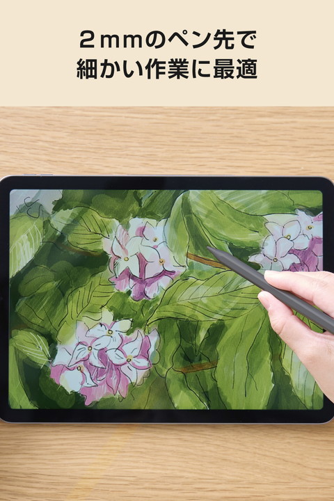 隙間時間の充電ですぐに使える!約30分でフル充電可能な急速充電機能を搭載した、汎用アクティブタッチペンです。約2.0mmのペン先で細かい作業、メモや絵を描くのにおすすめ。ペン先は導電性に優れたポリアセタール樹脂(POM)を採用し、滑らかな描き心地で画面を傷つけにくいです。