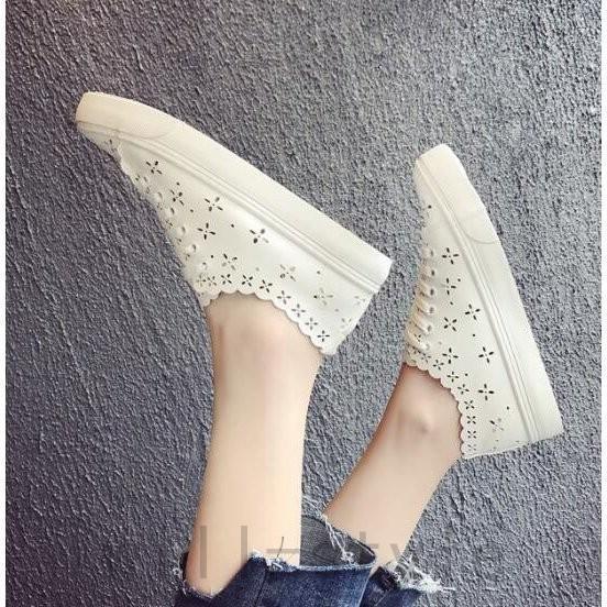 スニーカー レディース 軽量 PUレザー スリッポン フラットシューズ シューズ 花? ウォーキング 痛くない 靴 カジュアル 透かし彫り ホワイト