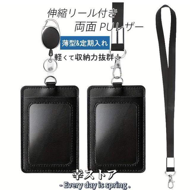 IDカードホルダー パスケース 伸縮リール付き 両面 PUレザー 透明窓 ネームホルダー 定期入れ 社員証 縦型 ネックストラップ