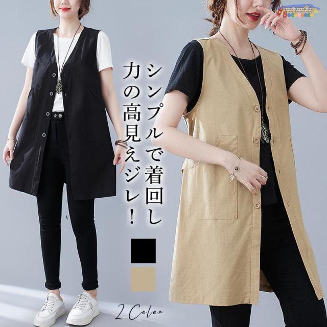 ロングベスト ジレ レディース 春夏 リネン Vネック トップス ノースリーブ ロングジレ ポケット付き 無地 羽織り おしゃれ 重ね着 通勤