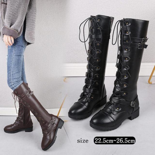 ロングブーツ レディース 美脚 長靴 秋 冬 ジョッキーブーツ 厚底 太ヒール 編み上げ レースアップ 保温 あたたかい 通気性 滑りにくい