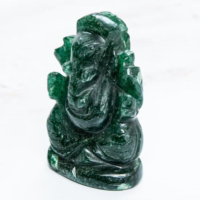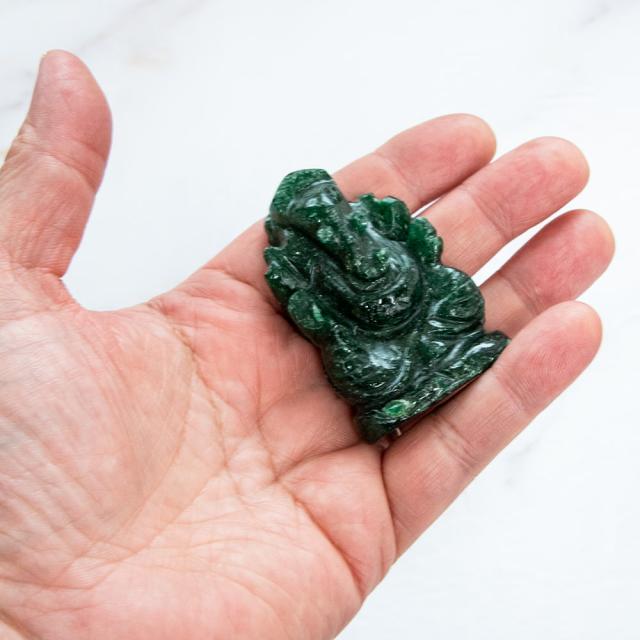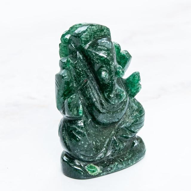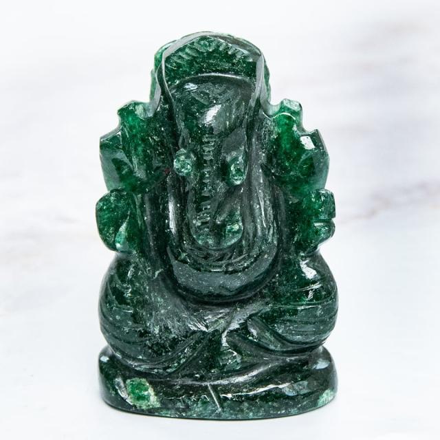 インド・ジャイプルから美しいガネーシャ像が届きました。アングリストーン(Anguri Stone = インド翡翠)を丹念に彫り上げた、静かな気品を湛えた仕上がりです。手塗りなどの装飾は施されておらず、石本来のなめらかな質感と優しい緑色が、自然の美しさを際立たせています。強い光を当てると、鮮やかな色合いがほのかに透けて浮かび上がります。アングリはパワーストーンとしても人気があり、持つ者に大いなる知恵と徳を授けるとされています。5月の誕生石としても知られ、古くは黄金よりも重宝されたと言われている、歴史ある石です。