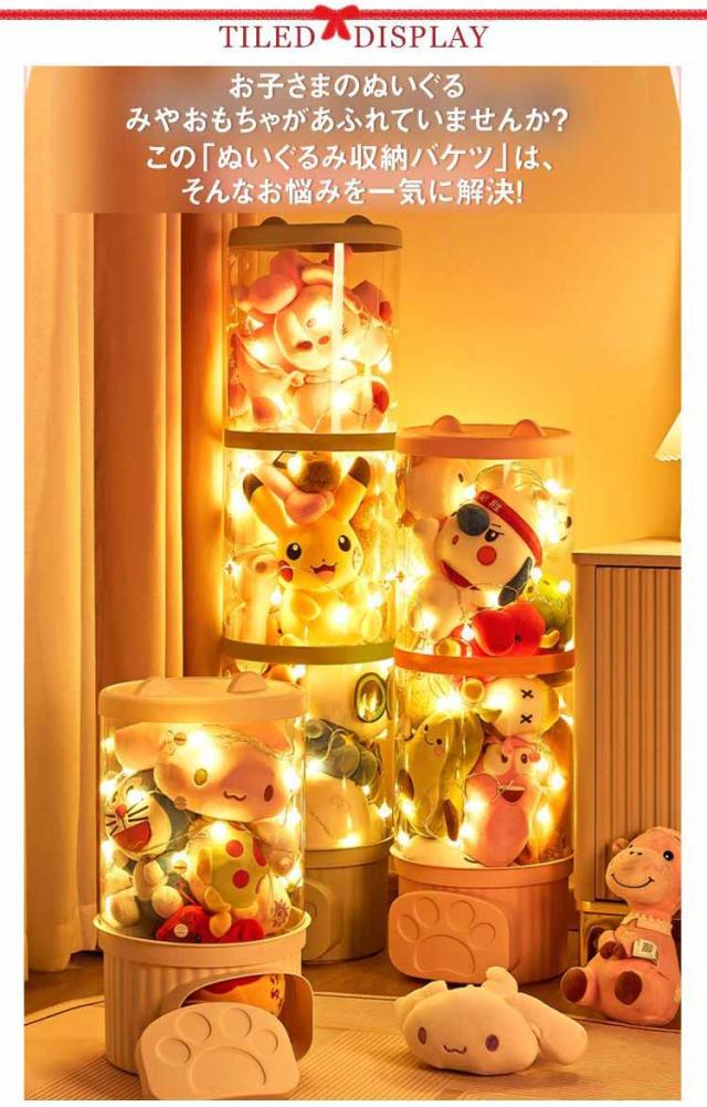 | お子さまのぬいぐるみやおもちゃがあふれていませんか? この「ぬいぐるみ収納バケツ」は、そんなお悩みを一気に解決! 透明で中身がひと目で分かるうえ、厚手のPP素材を使用しているので丈夫で長く使えます。 大容量だから、大きめのおもちゃやぬいぐるみもまとめてスッキリ収納可能。 蓋付きで保管&防塵効果抜群。 また、プレゼント用のギフトバケツとしてもおしゃれに使えます。 お部屋のインテリアにもなじむシンプルなデザインで、実用性と可愛さを兼ね備えたアイテムです。 | |