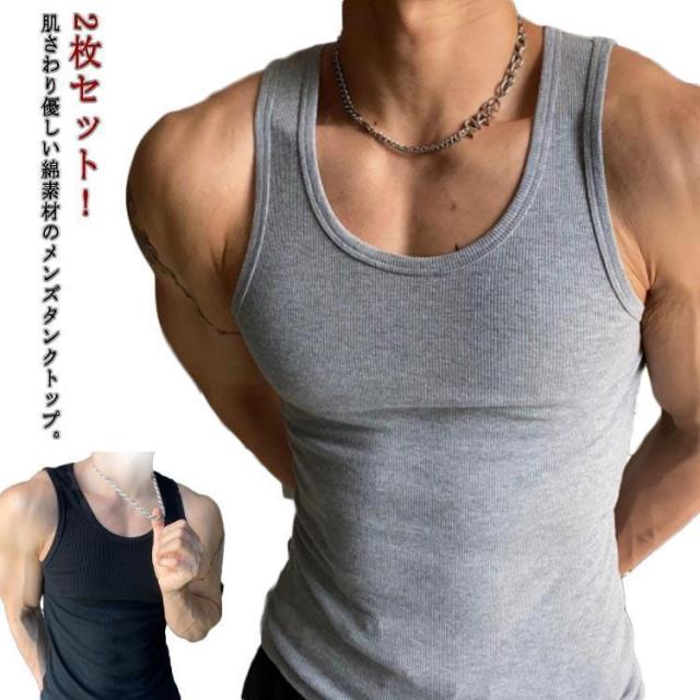 2枚セット タンクトップ インナートップス 綿 無地 コットン スポーツ フィットネス ストレッチ 袖なし メンズ タイト インナートップス Uネッ