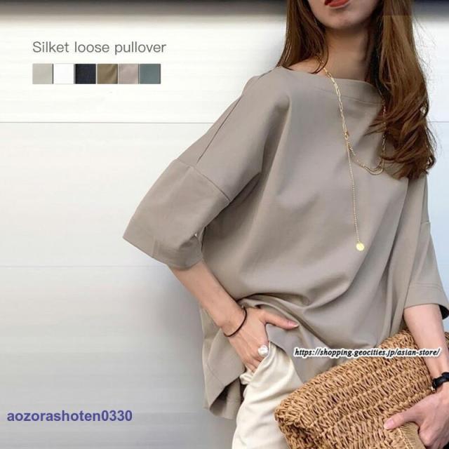 ボートネック 半端袖 無地 公園 春 肩落ちシルエット