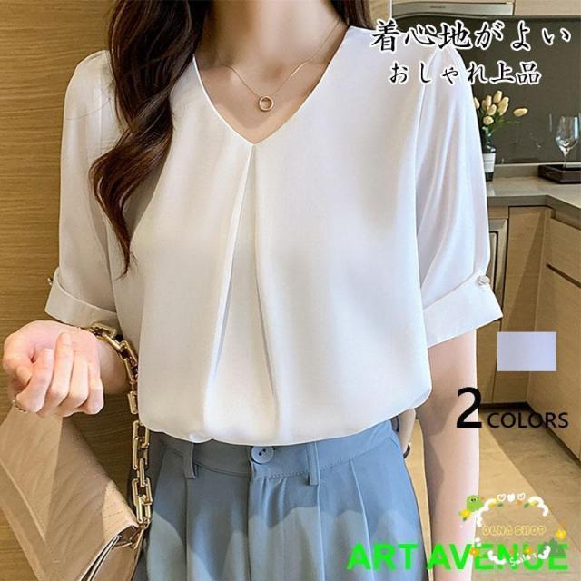 ブラウス 半袖 レディース tシャツ vネック オフィス 夏 ゆったり 無地 おしゃれ 大きいサイズ着痩せ 通勤 通学 カジュアル お出かけ オフィス