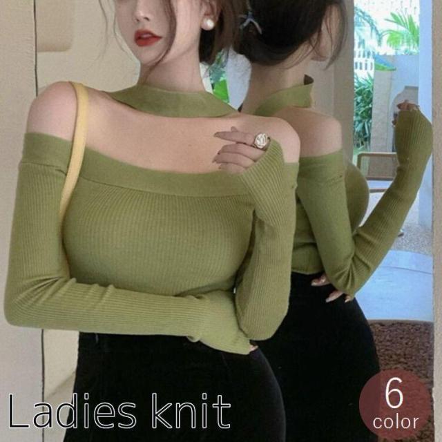 ニット レディース 女性用 トップス セーター 長袖 オフショルダー ボートネック リブ タイト 無地 薄手 おしゃれ セクシー カジュアル 肩出し