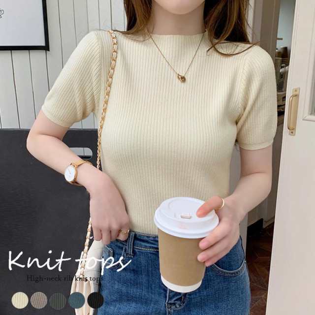 リブ タイトニット トップス レディース 半袖 ニットソー プルオーバー ハイネック きれいめ ニットセーター