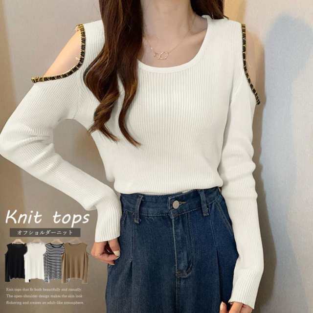 ニットソー 無地 ボーダー柄 ニットセーター セクシー オフショルダーニット クルーネック 肩見せ リブニット