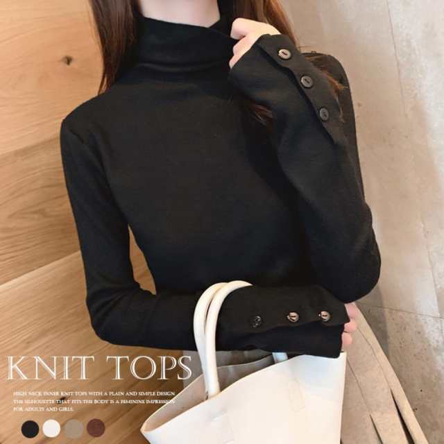 ニットソー 着やせ ニットインナー タートルネック 袖ボタン 長袖ニット 無地 シンプル タイトトップス